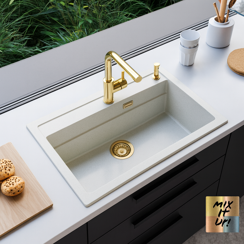 Materijal i boja? (Inox za bezvremenski izgled i higijenu, Granital za boje i taktilnost, Monarch za metalične plemenite nijanse – zlato, bronza, bakar, antracit.)