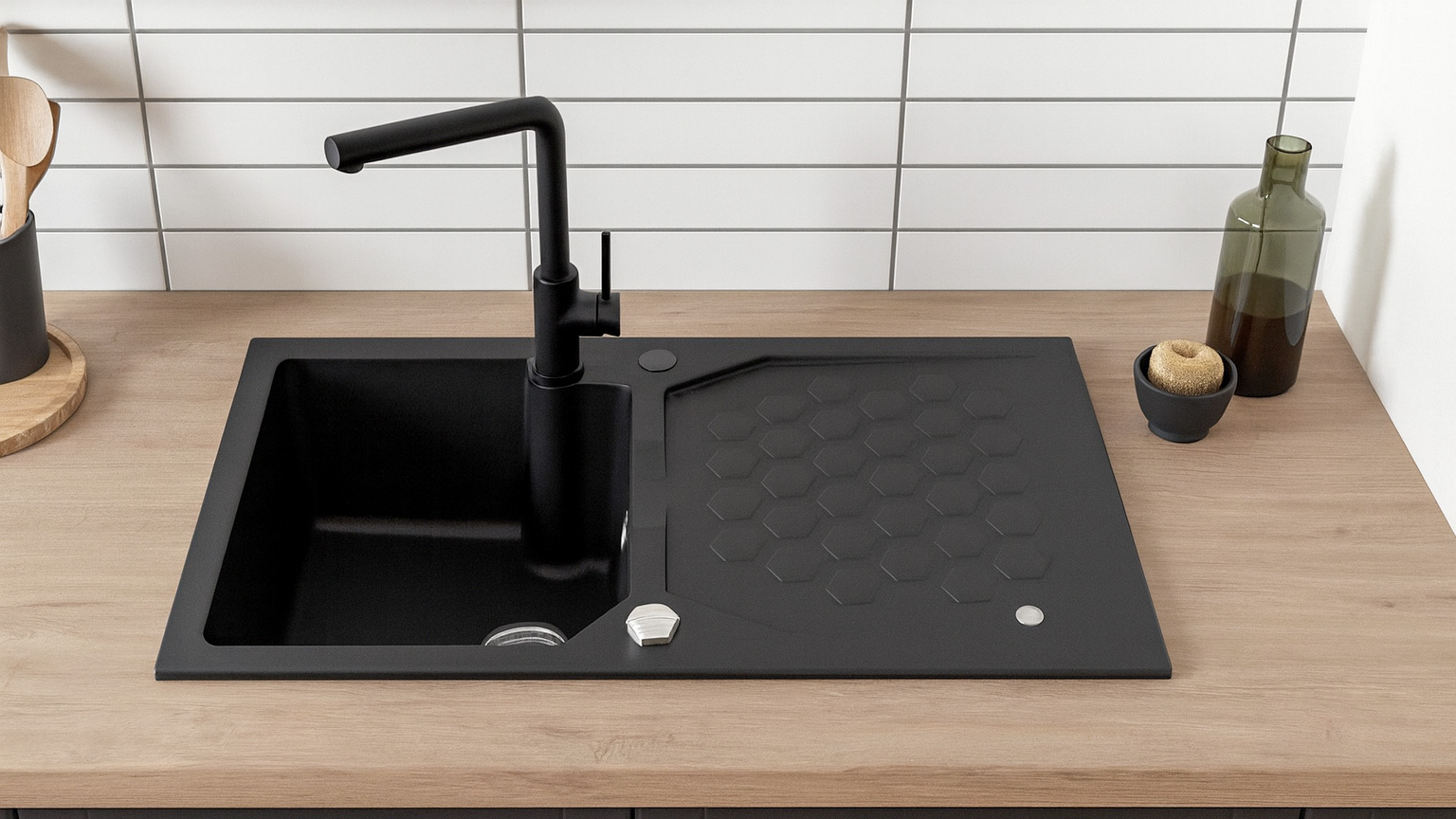 Sensual 30 – zaobljena estetika, heksagonalni dizajn ocedne površine i Pop-Up mehanizam, u Granital Plus materijalu.